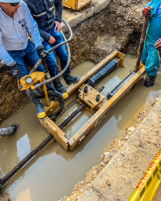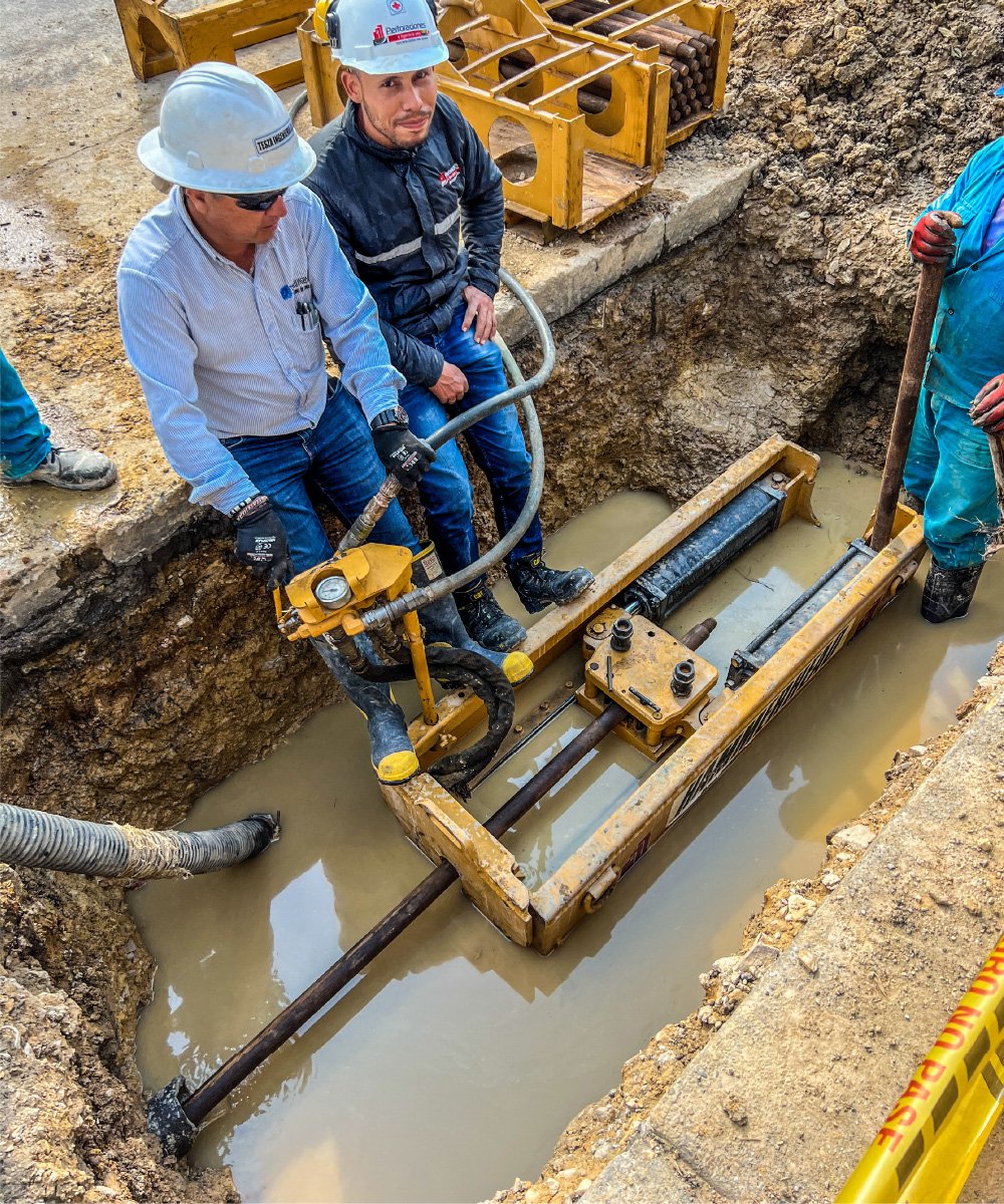 La máquina de restitución reemplaza tuberías fracturables de hasta 60″ y 100 m de longitud, reventando la vieja e instalando una nueva de polietileno del mismo o mayor diámetro.